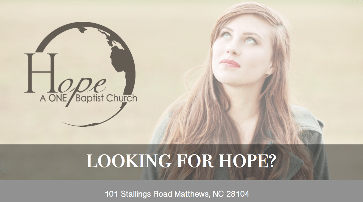 HOPE is located on the corner of Stallings Road and Old Monroe Road (West John Street) in the same area as Phat Daddy’s Cafe. We are less than 5 minutes from Matthews, 10 minutes from Mint Hill, and 15 minutes from Charlotte.